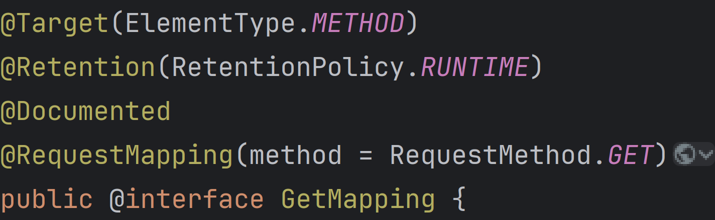 - @GetMapping : HTTP GET 메소드를 사용하는 어노테이션으로 어노테이션 내부@RequestMapping(method = RequestMethod.GET) 을 가지고 있는 합성 어노테이션